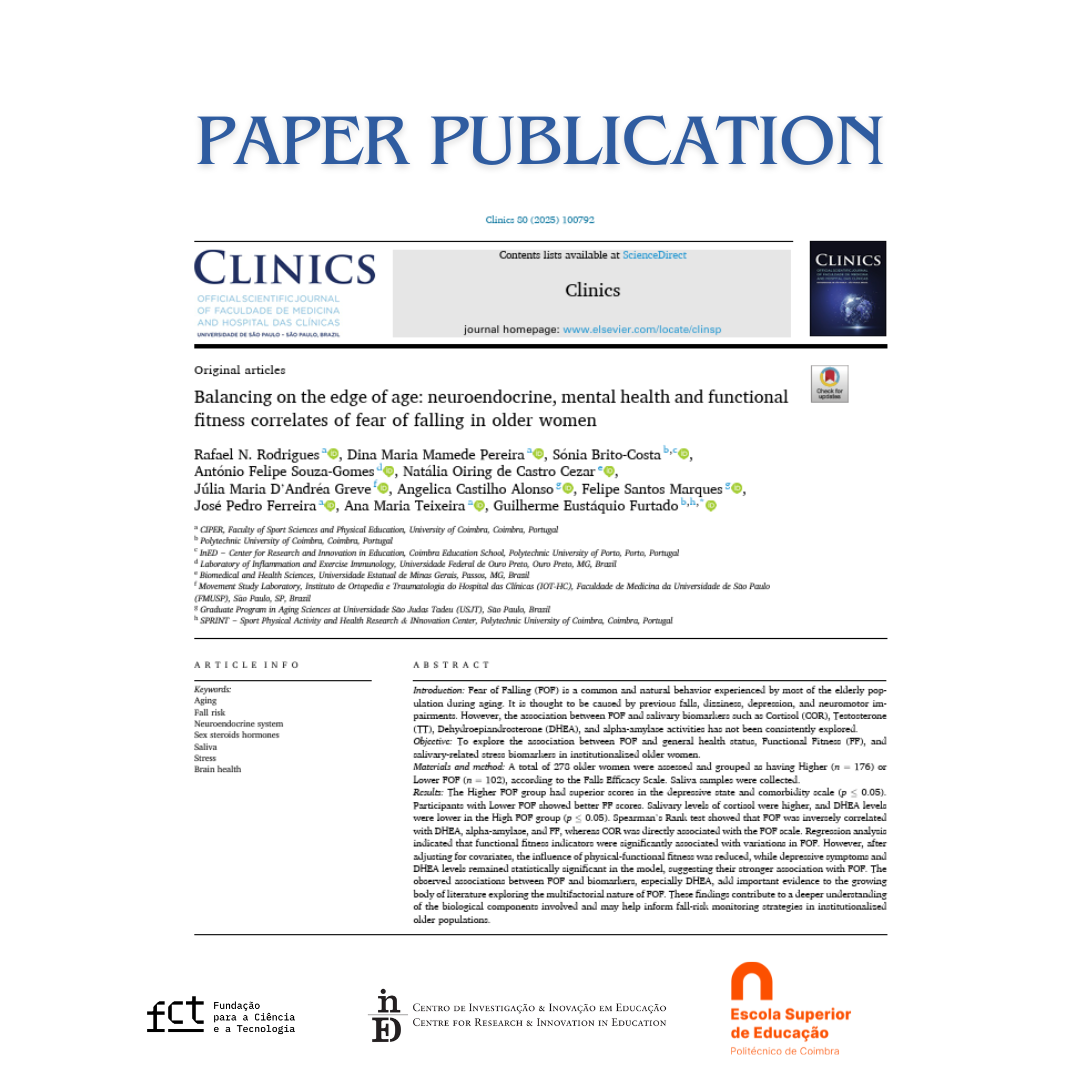A investigadora Sónia Brito-Costa, do inED | ESEC, publicou recentemente o artigo “Balancing on the edge of age: neuroendocrine, mental health and functional fitness correlates of fear of falling in older women” na revista Clinics (ELSEVIER).